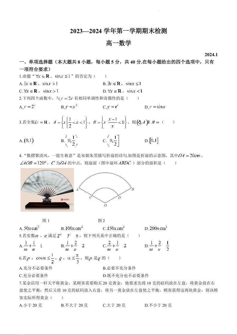 江苏省扬州市2023-2024学年高一上学期期末考试数学+答案