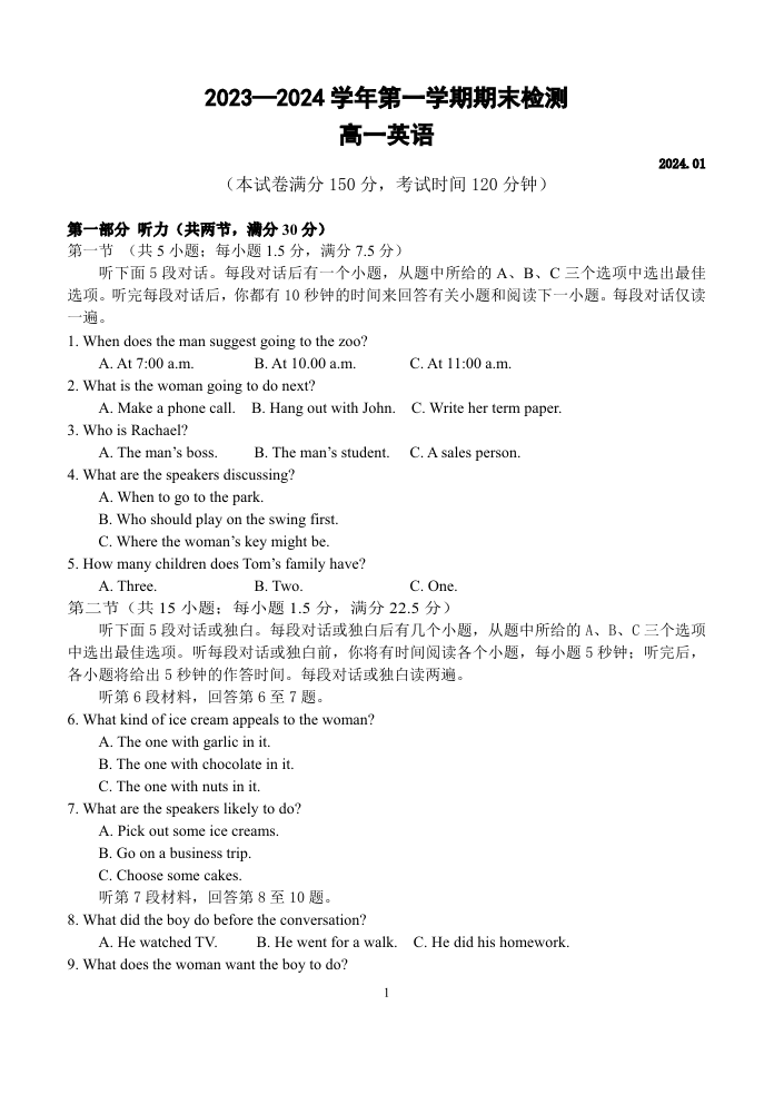 江苏省扬州市2023-2024学年高一上学期期末考试英语