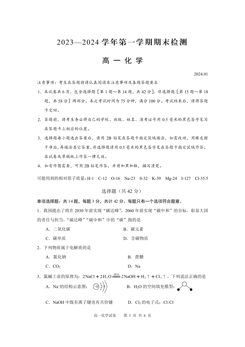 江苏省扬州市2023-2024学年高一上学期期末考试化学