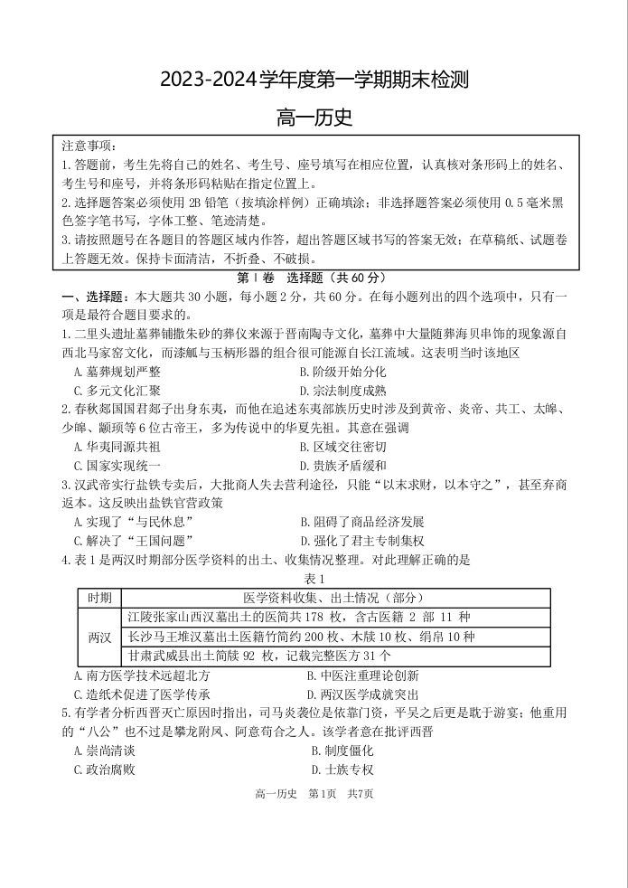 江苏省扬州市2023-2024学年高一上学期期末考试历史+答案
