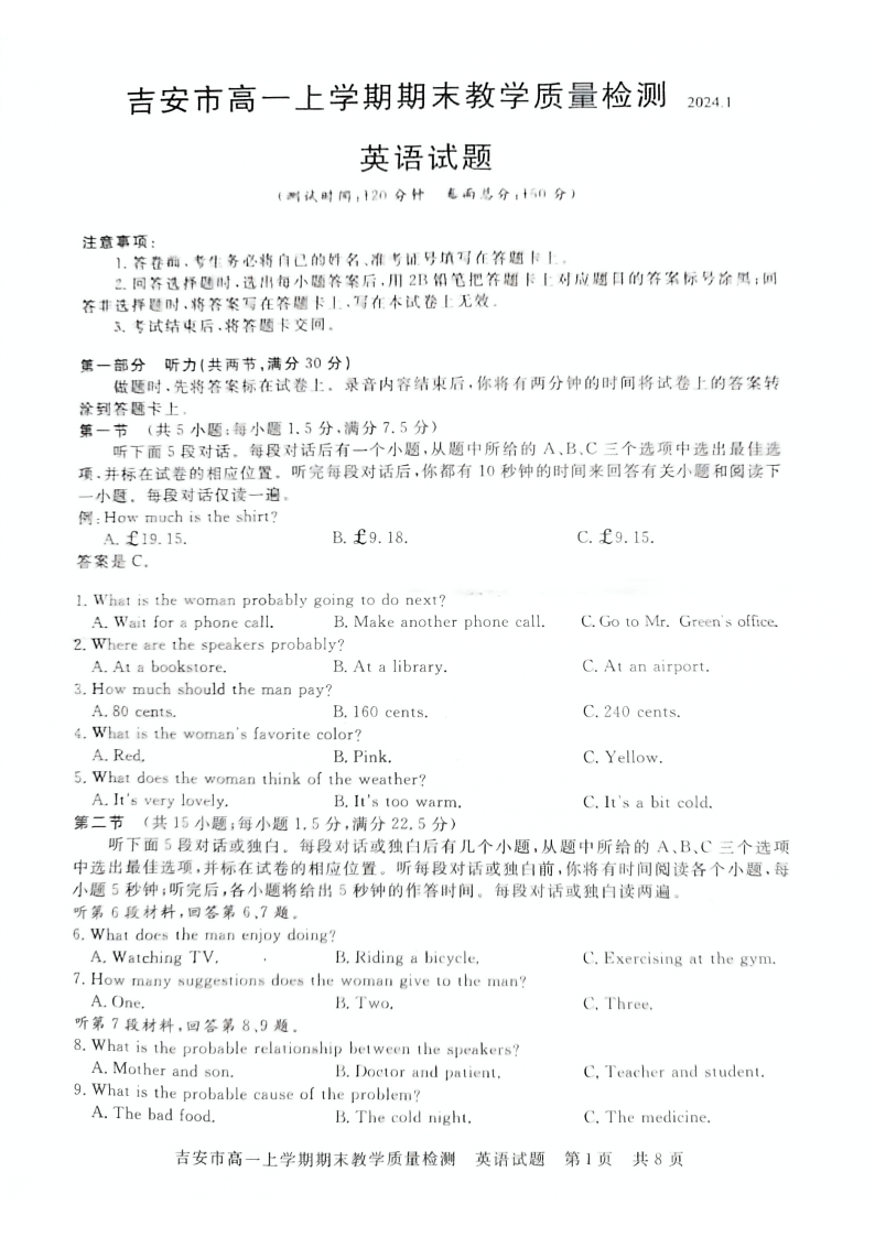 江西省吉安市2023-2024学年高一上学期1月期末考试英语+答案