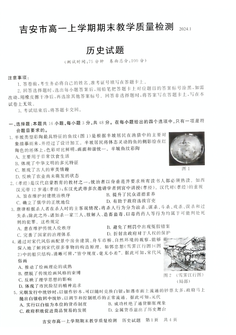 江西省吉安市2023-2024学年高一上学期1月期末考试历史
