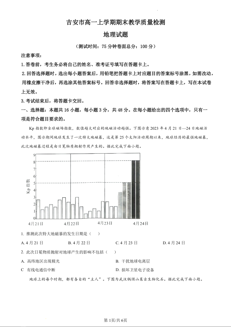 江西省吉安市2023-2024学年高一上学期1月期末考试地理(原卷版)