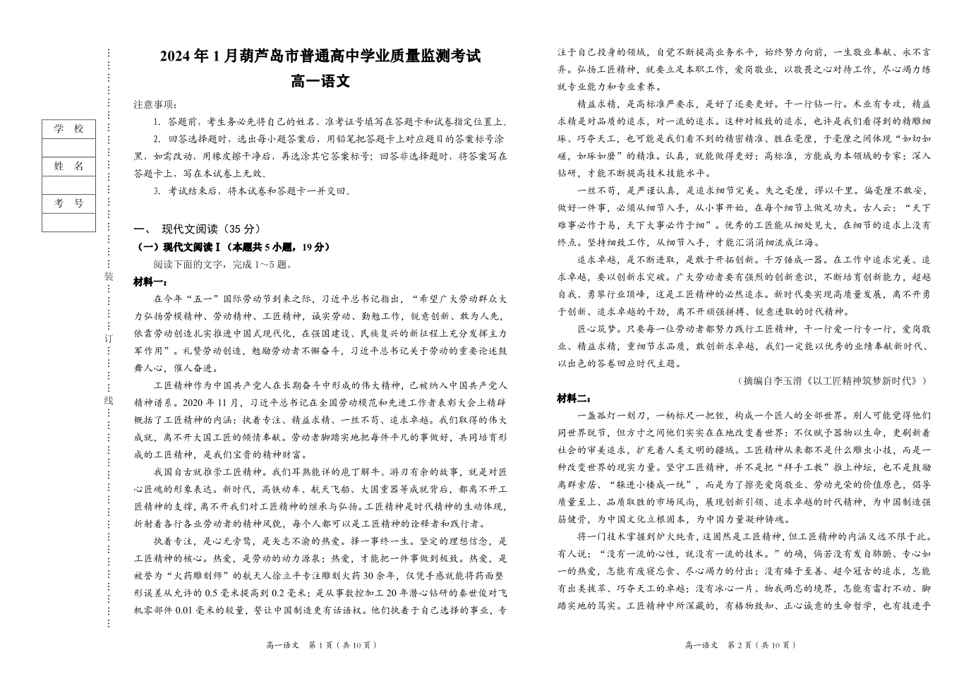 辽宁省葫芦岛市2023-2024学年高一上学期1月普通高中学业质量监测考试语文