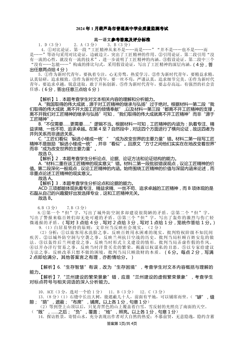 辽宁省葫芦岛市2023-2024学年高一上学期1月普通高中学业质量监测考试语文答案