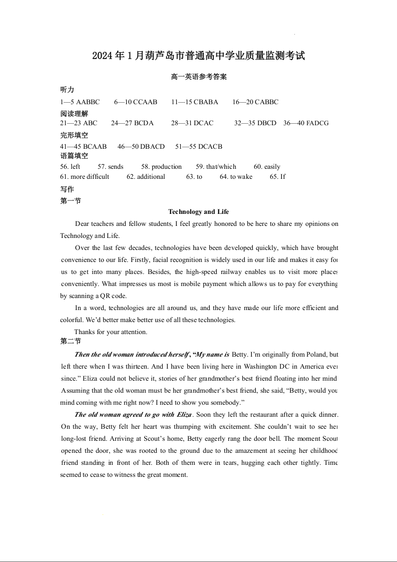 辽宁省葫芦岛市2023-2024学年高一上学期1月普通高中学业质量监测考试英语答案