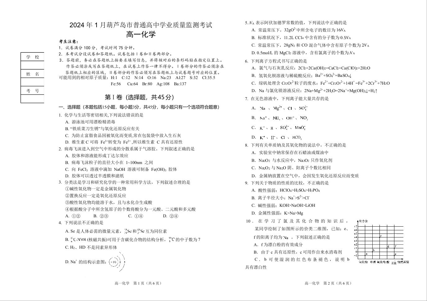 辽宁省葫芦岛市2023-2024学年高一上学期1月普通高中学业质量监测考试化学