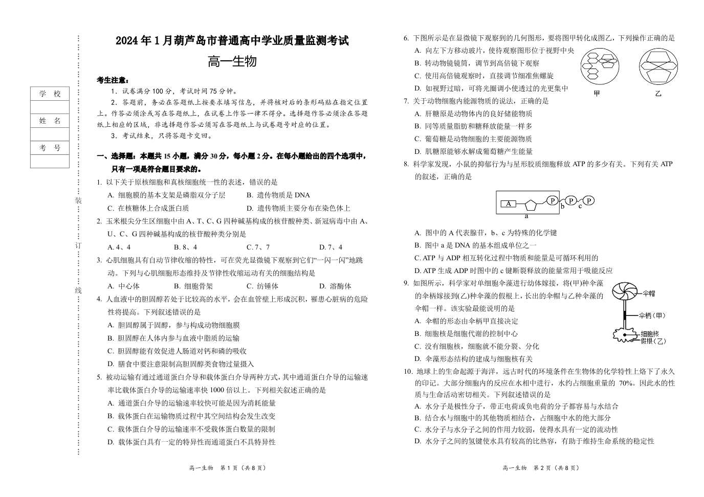 辽宁省葫芦岛市2023-2024学年高一上学期1月普通高中学业质量监测考试生物