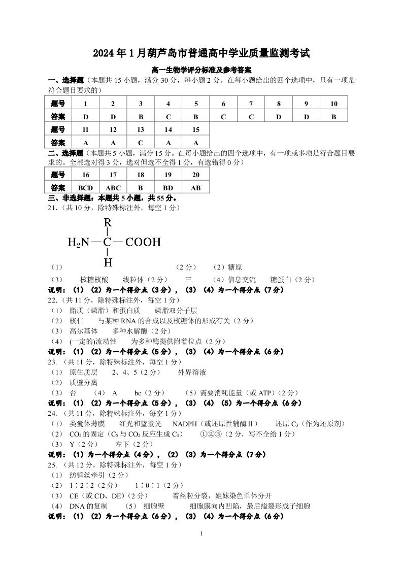 辽宁省葫芦岛市2023-2024学年高一上学期1月普通高中学业质量监测考试生物答案