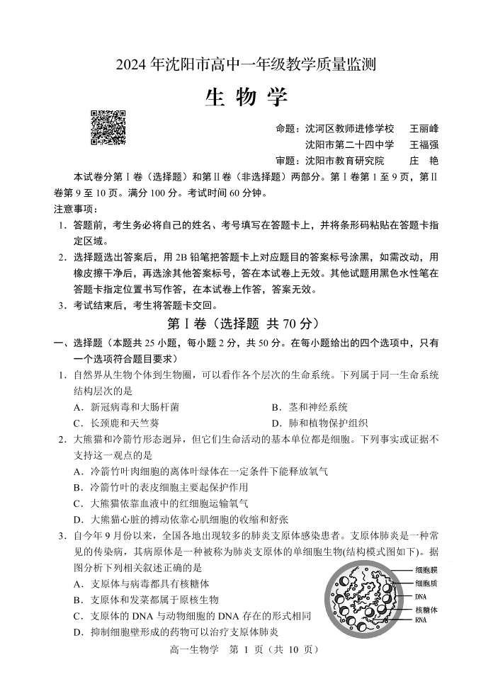 辽宁省沈阳市2023-2024学年高一上学期期末考试生物