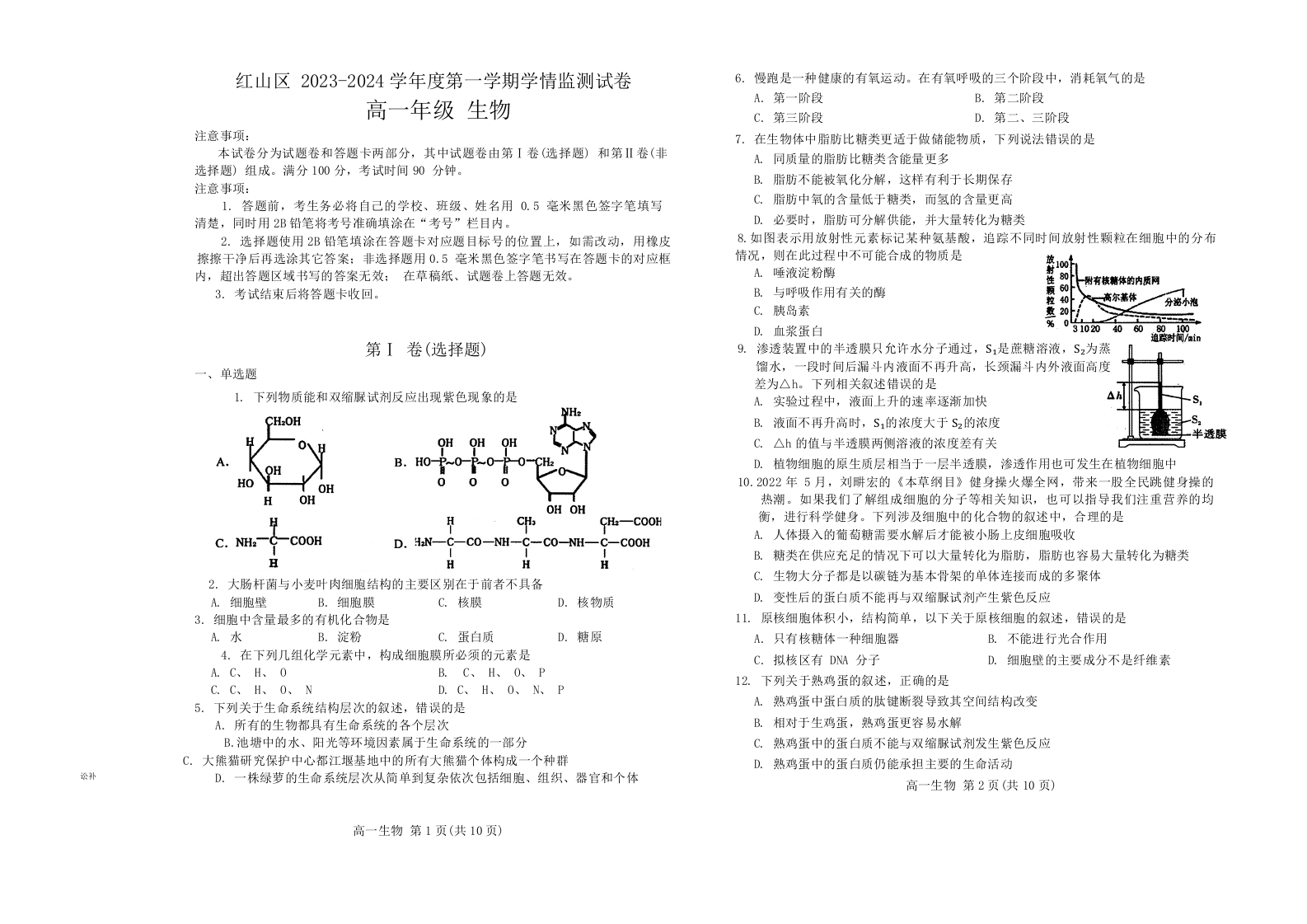 内蒙古自治区赤峰市红山区2023-2024学年高一上学期1月期末测试生物+答案