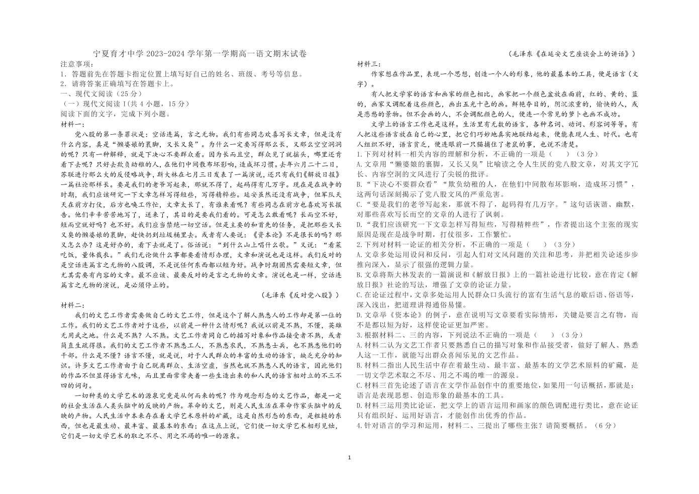 宁夏回族自治区银川市育才中学2023-2024学年高一上学期期末考试语文