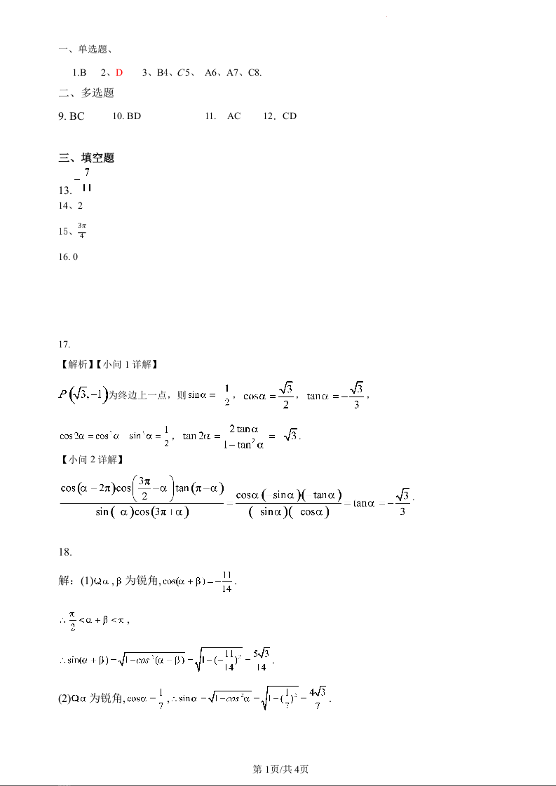 宁夏回族自治区银川市育才中学2023-2024学年高一上学期期末考试数学答案