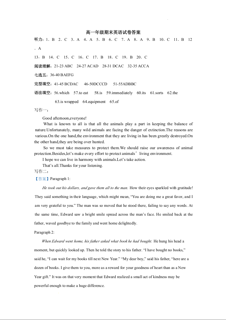 宁夏回族自治区银川市育才中学2023-2024学年高一上学期期末考试英语答案