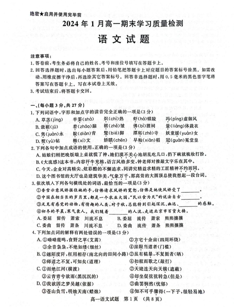 山东省济南市2023-2024学年高一上学期期末考试语文
