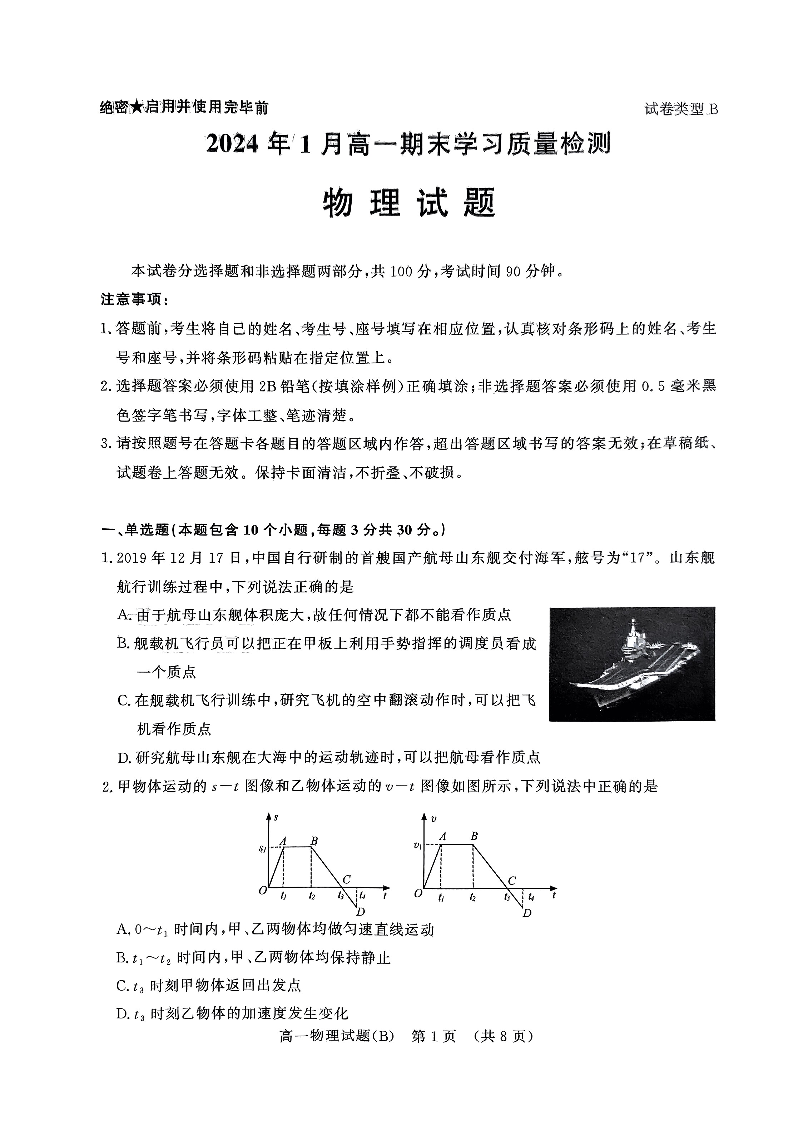 山东省济南市2023-2024学年高一上学期期末考试物理