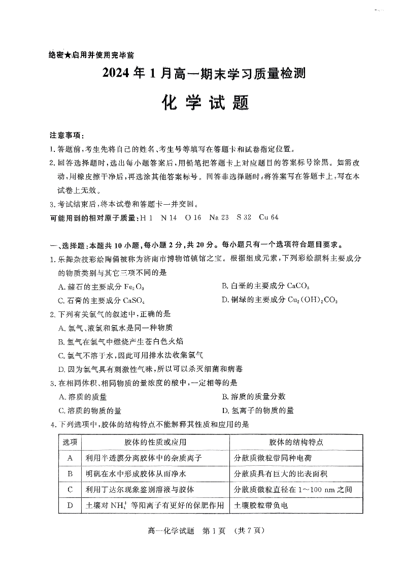山东省济南市2023-2024学年高一上学期期末考试化学