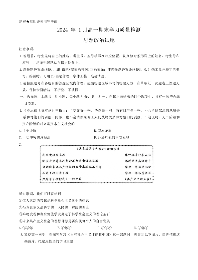 山东省济南市2023-2024学年高一上学期期末考试政治