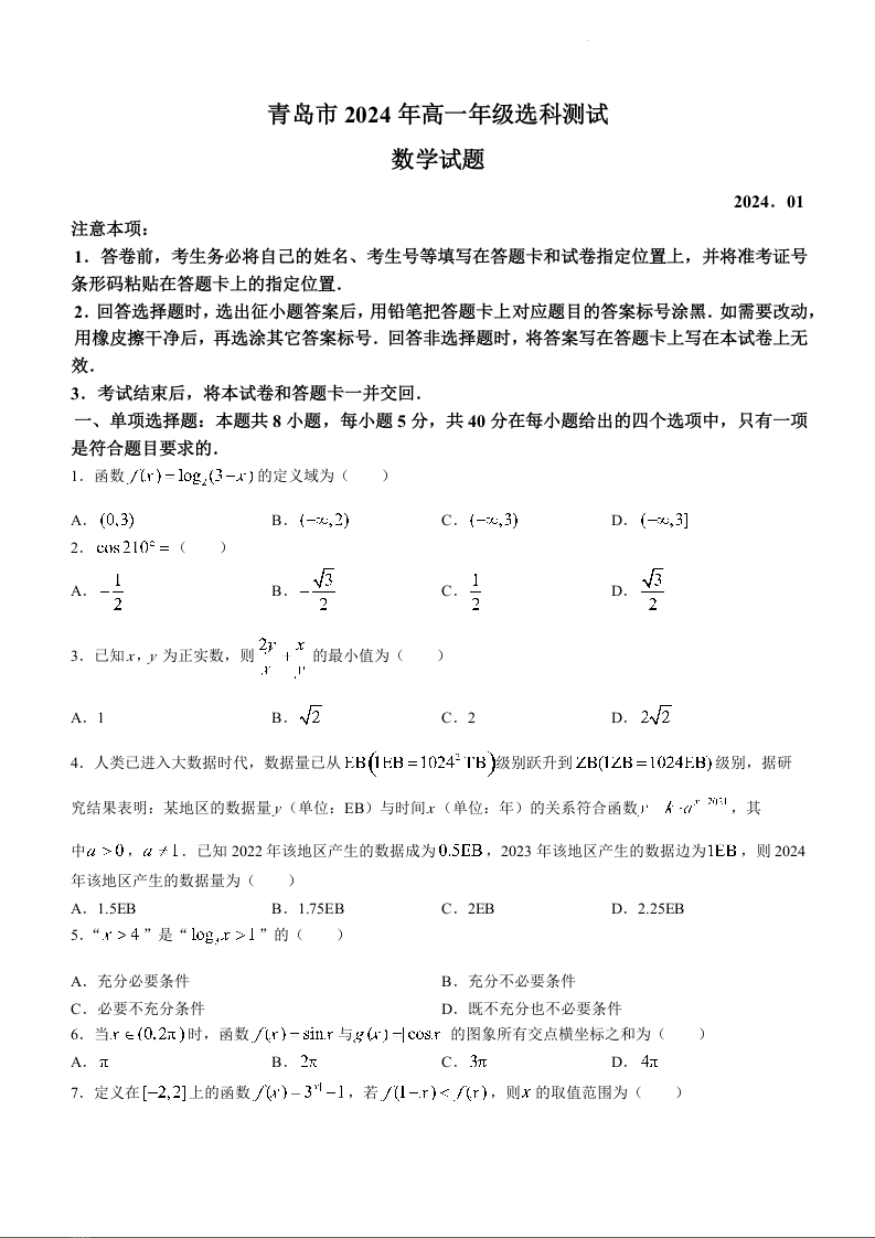 山东省青岛市2023-2024学年高一上学期(期末)选科测试数学+答案