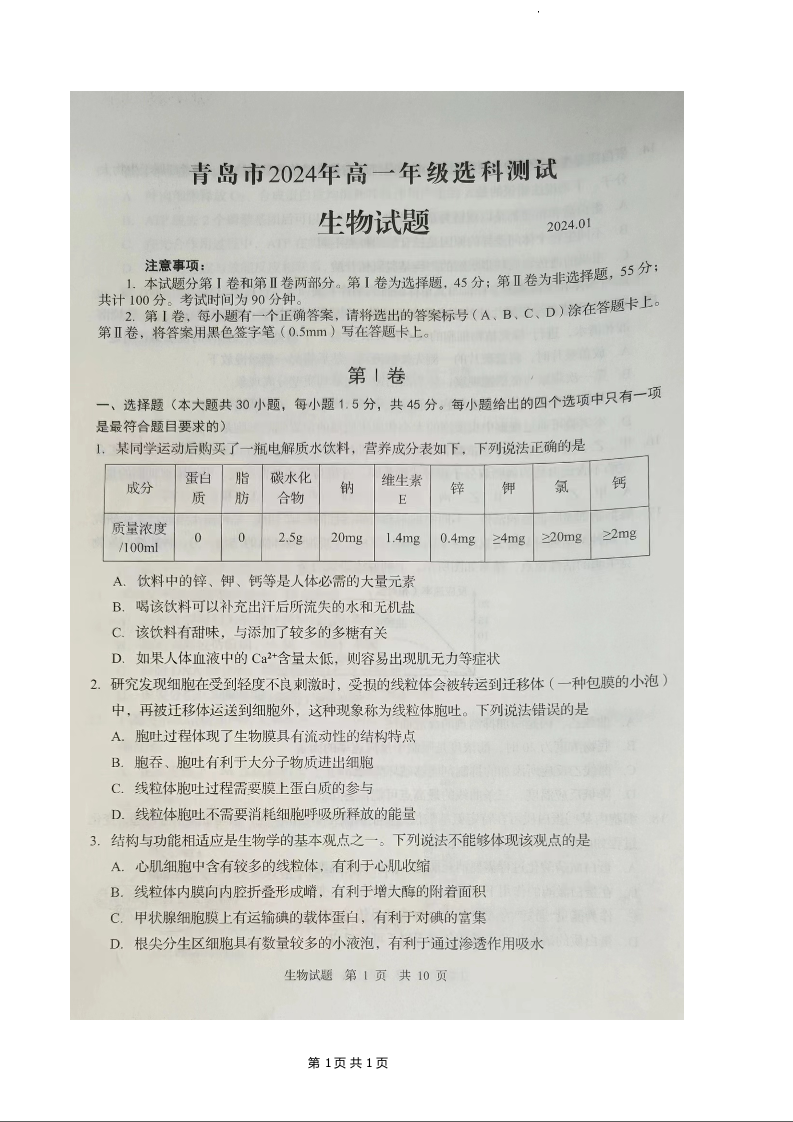 山东省青岛市2023-2024学年高一上学期(期末)选科测试生物+答案