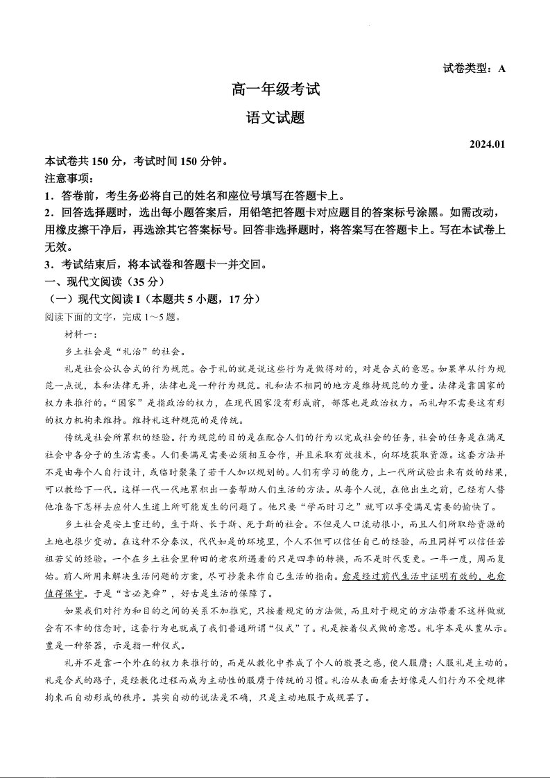 山东省泰安市2023-2024学年高一上学期1月期末测试语文+答案