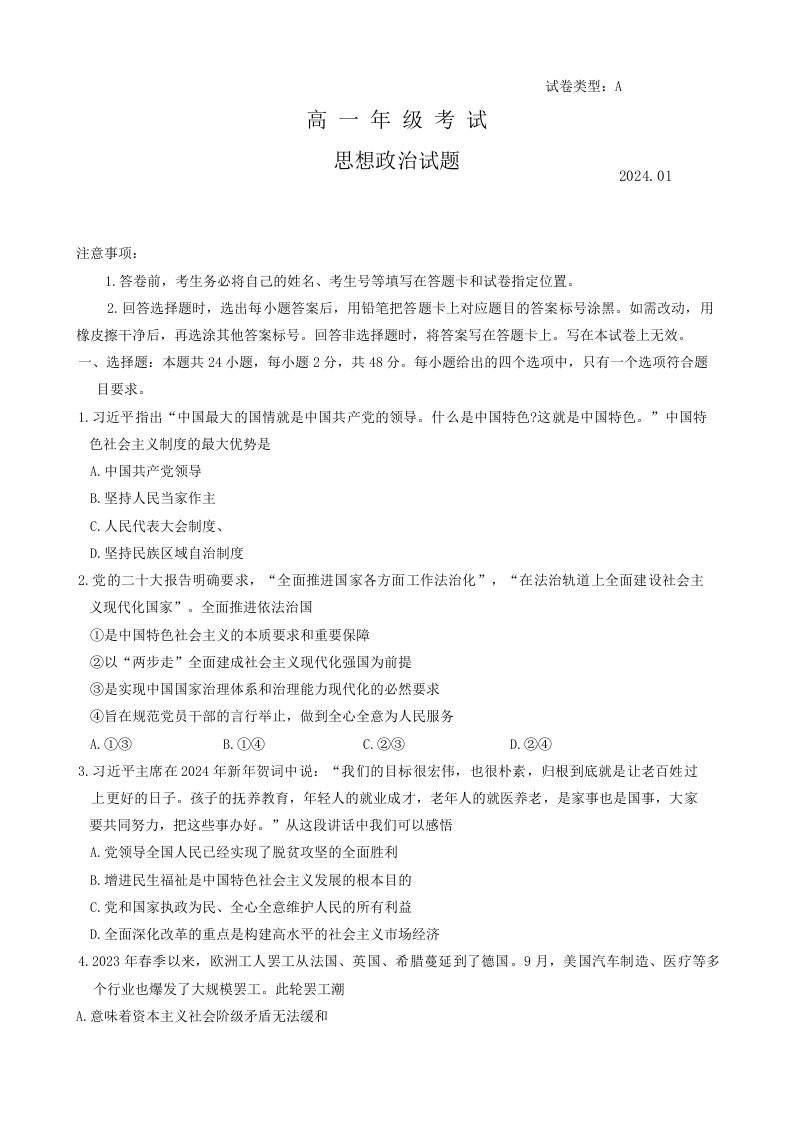 山东省泰安市2023-2024学年高一上学期1月期末测试政治