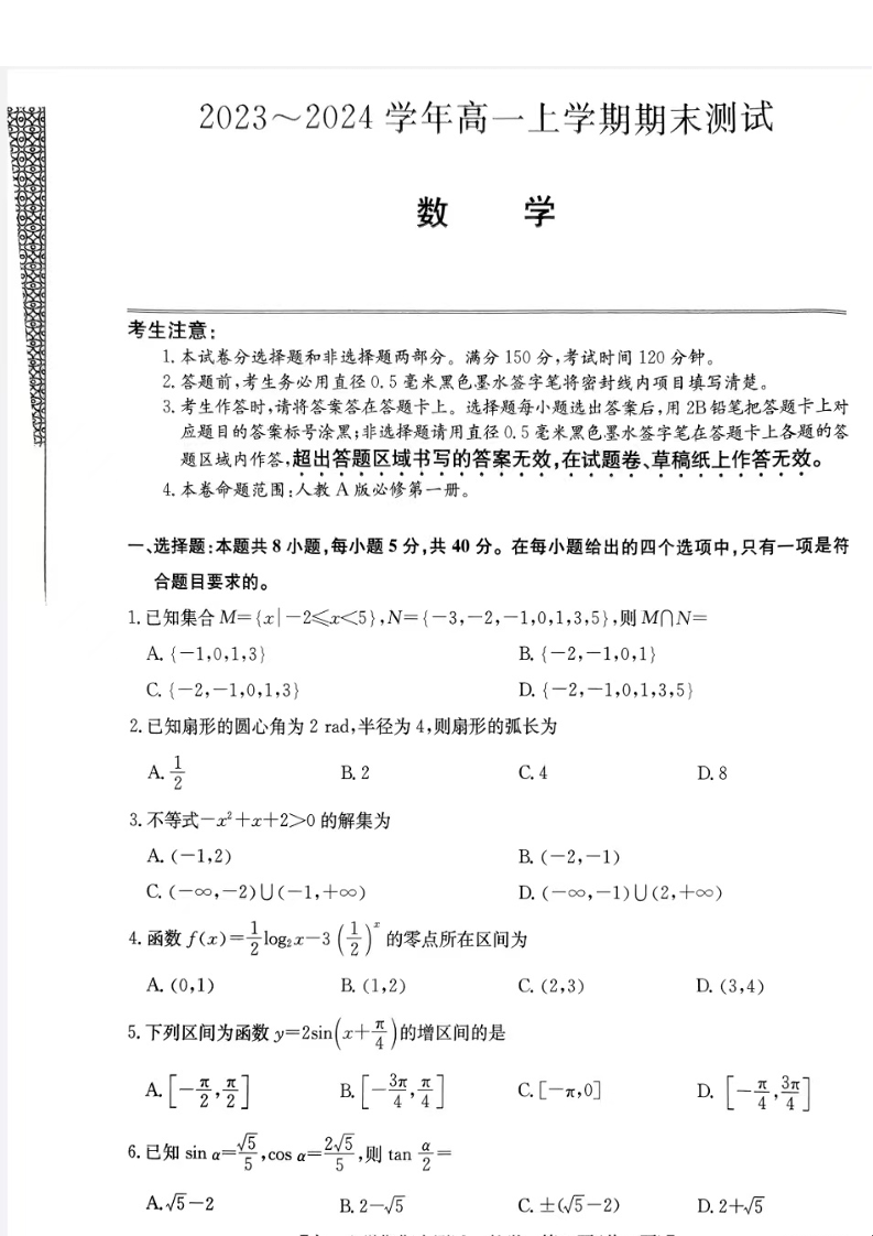 山西省2023-2024学年高一上学期1月期末联考数学