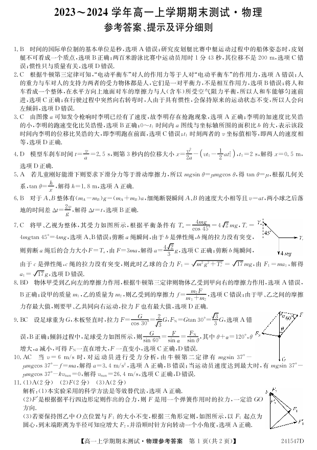 山西省2023-2024学年高一上学期1月期末联考物理答案