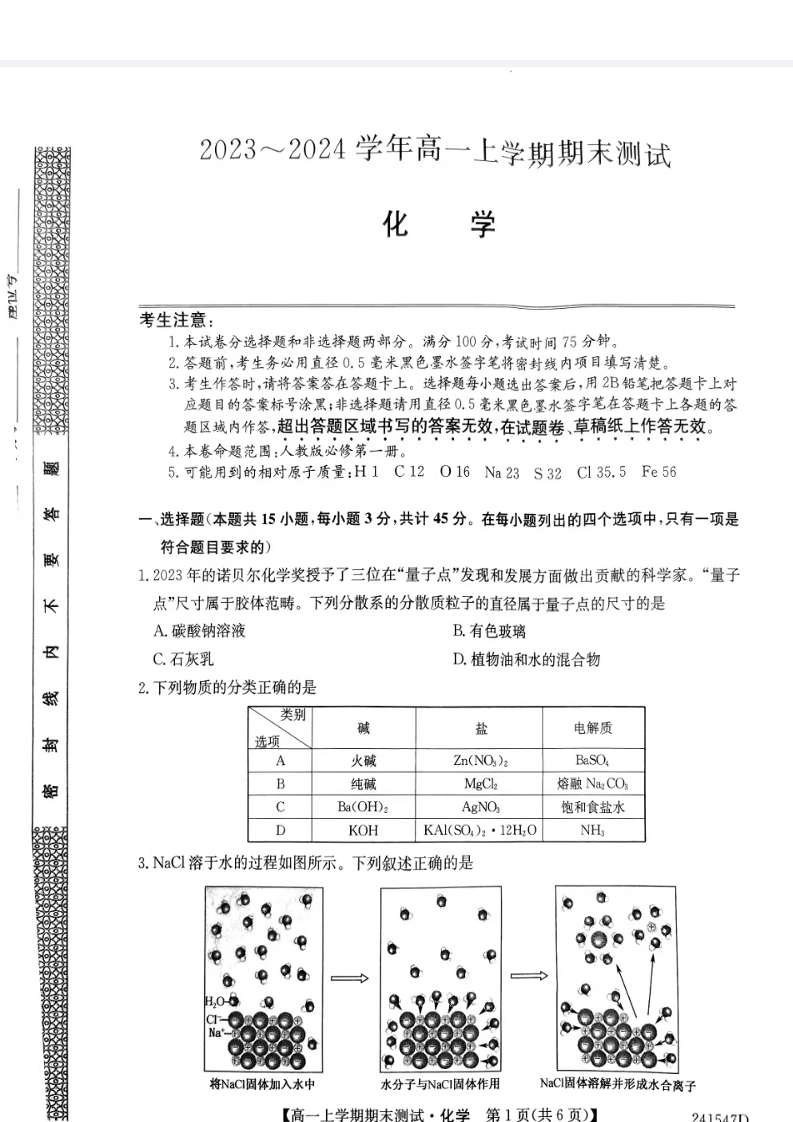山西省2023-2024学年高一上学期1月期末联考化学