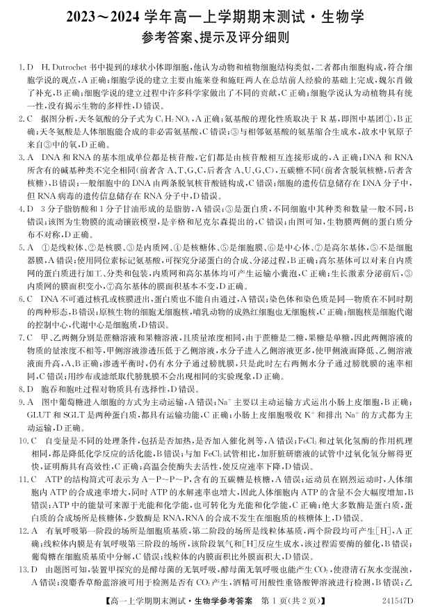 山西省2023-2024学年高一上学期1月期末联考生物答案
