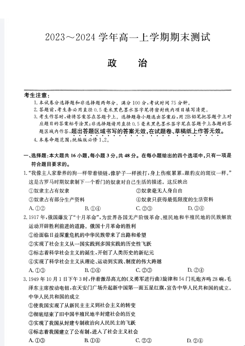 山西省2023-2024学年高一上学期1月期末联考政治