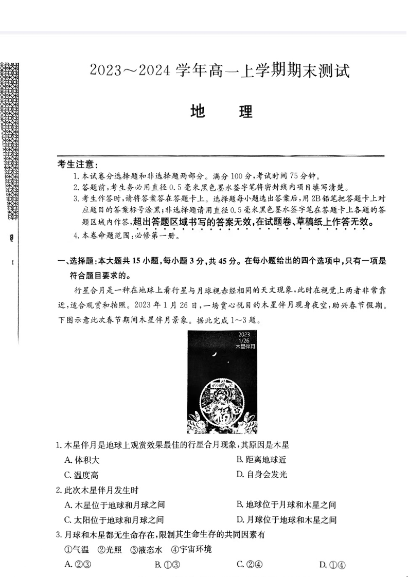 山西省2023-2024学年高一上学期1月期末联考地理