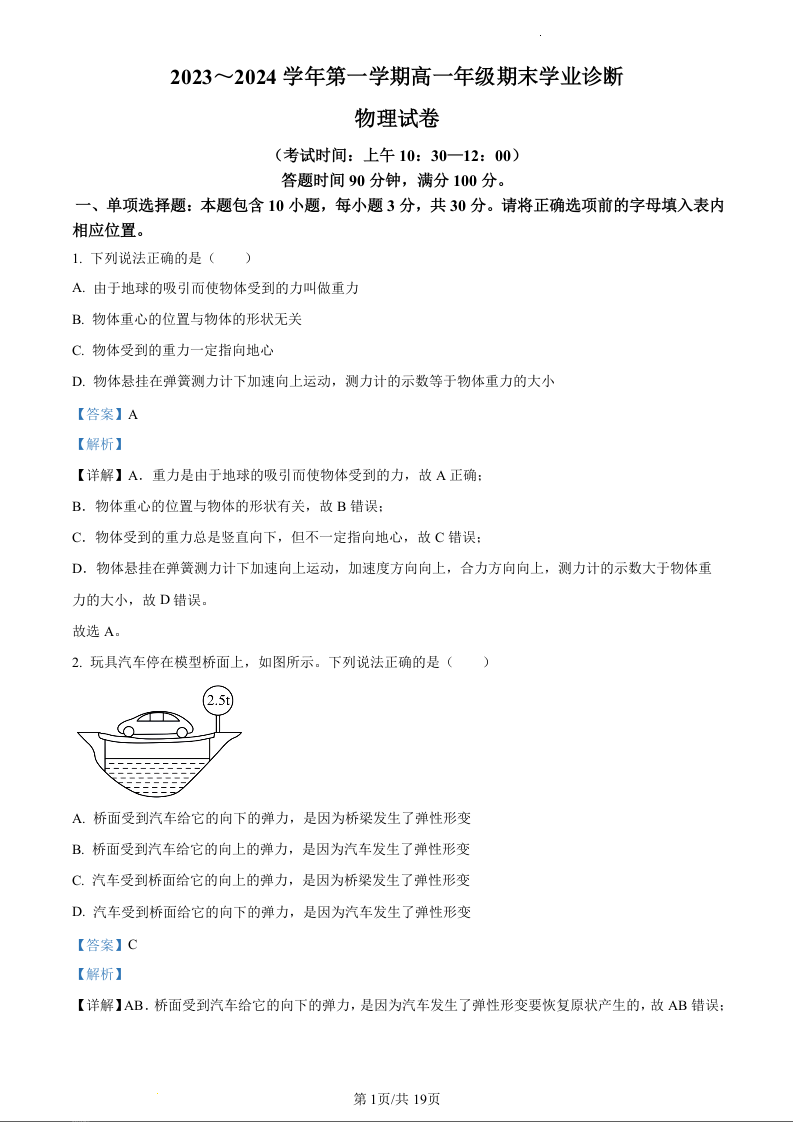 山西省太原市2023-2024学年高一上学期1月期末测试物理(精品解析版)