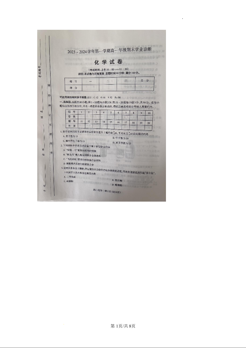 山西省太原市2023-2024学年高一上学期1月期末测试化学