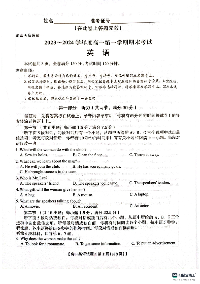 陕西省安康市2023-2024学年高一上学期期末质量检测英语