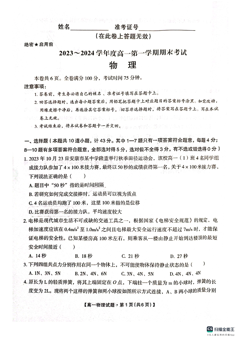 陕西省安康市2023-2024学年高一上学期期末质量检测物理
