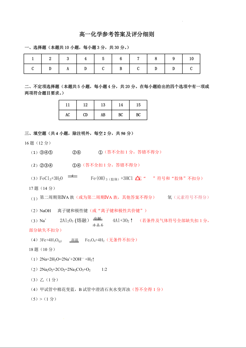 陕西省安康市2023-2024学年高一上学期期末质量检测化学答案