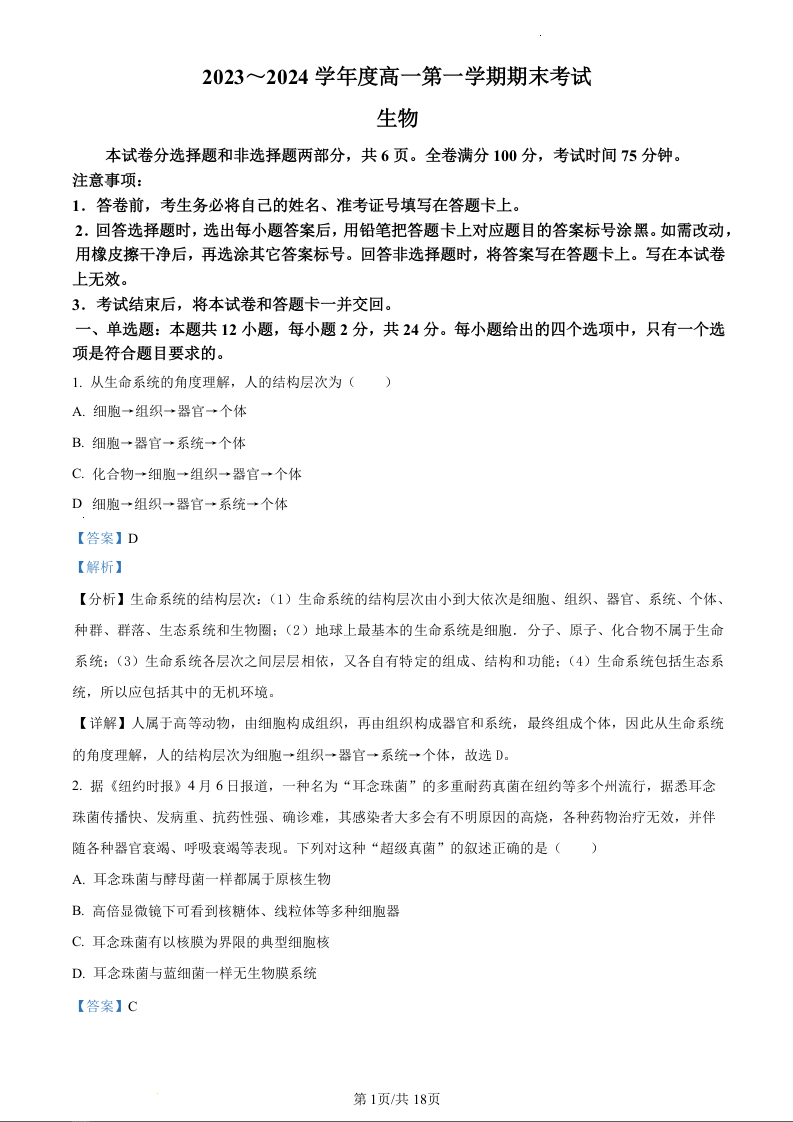 陕西省安康市2023-2024学年高一上学期期末质量检测生物(精品解析版)