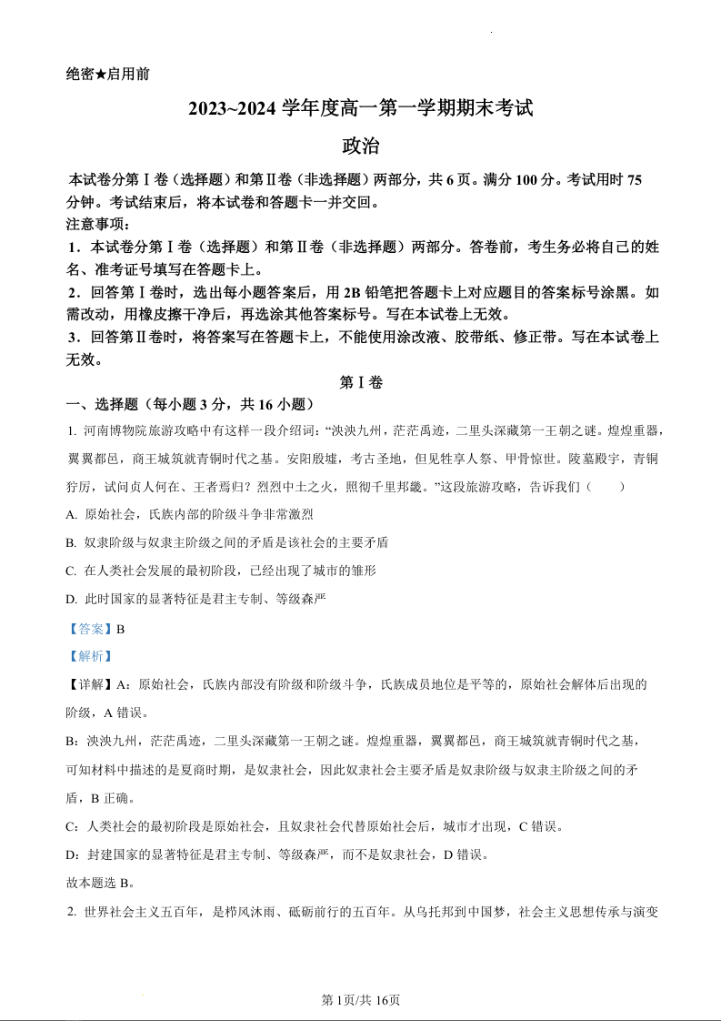 陕西省安康市2023-2024学年高一上学期期末质量检测政治(精品解析版)