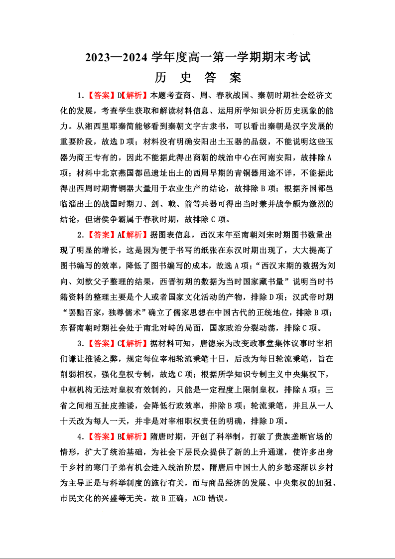 陕西省安康市2023-2024学年高一上学期期末质量检测历史答案