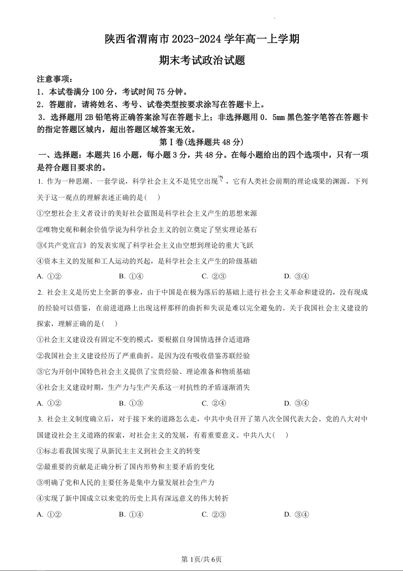 陕西省渭南市2023-2024学年高一上学期期末考试政治(原卷版)
