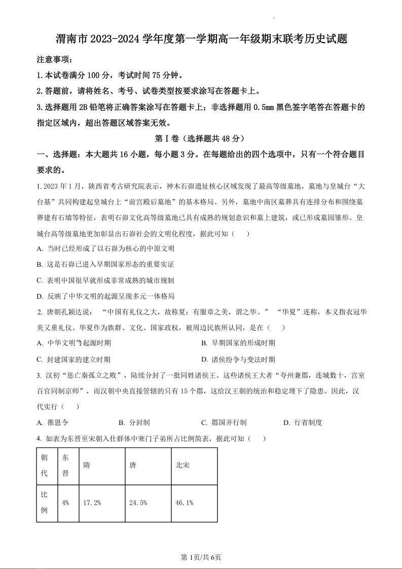 陕西省渭南市2023-2024学年高一上学期期末考试历史(原卷版)