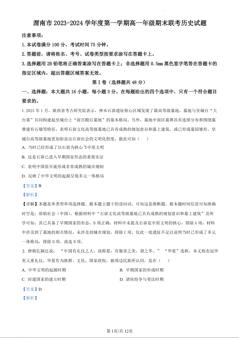 陕西省渭南市2023-2024学年高一上学期期末考试历史(精品解析版)