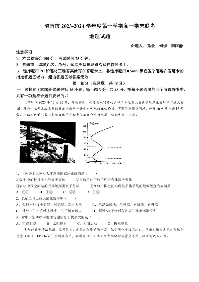 陕西省渭南市2023-2024学年高一上学期期末考试地理