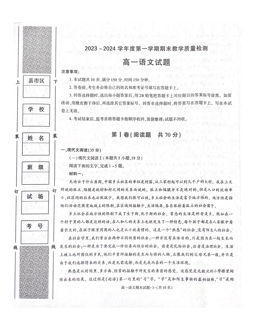 陕西省咸阳市2023-2024学年高一上学期期末考试语文