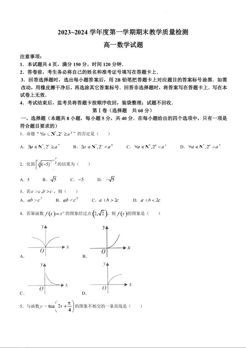 陕西省咸阳市2023-2024学年高一上学期期末考试数学+答案