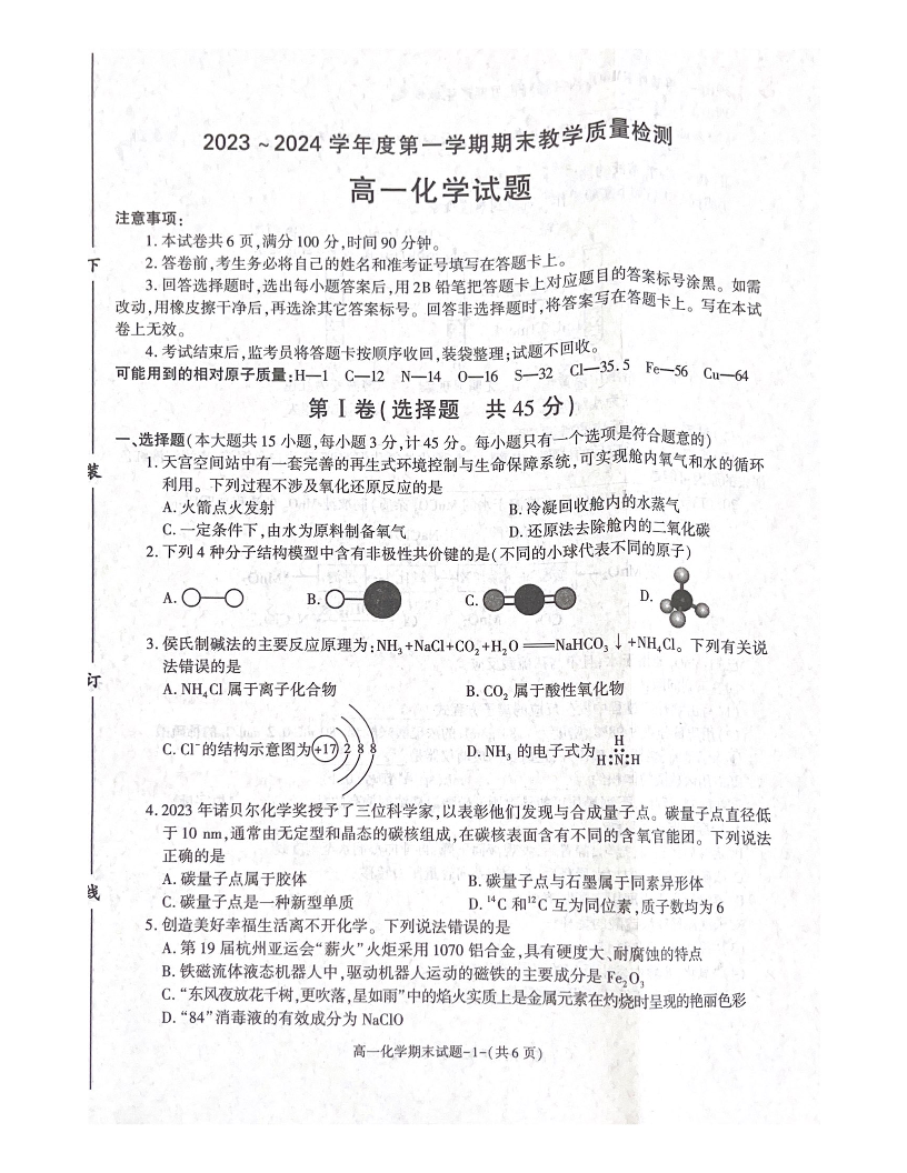 陕西省咸阳市2023-2024学年高一上学期期末考试化学