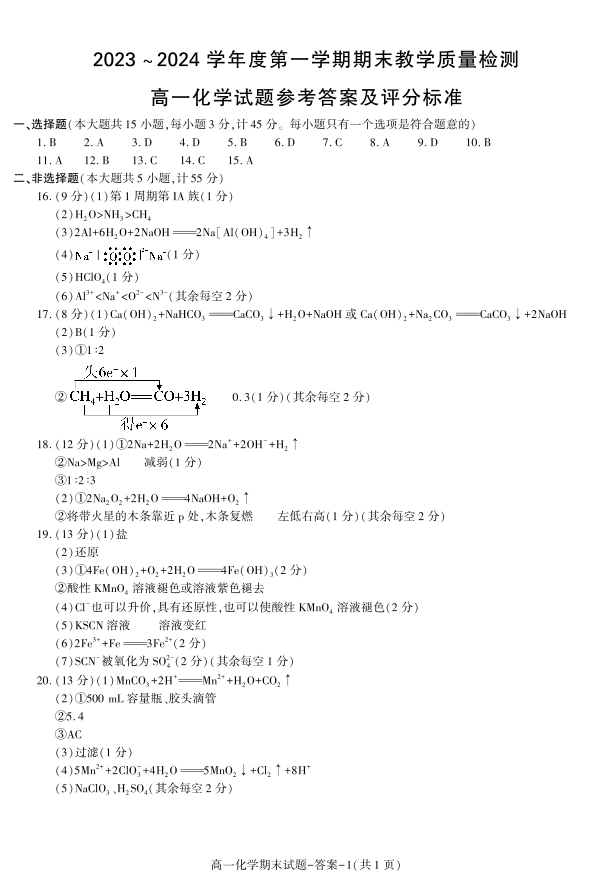 陕西省咸阳市2023-2024学年高一上学期期末考试化学答案