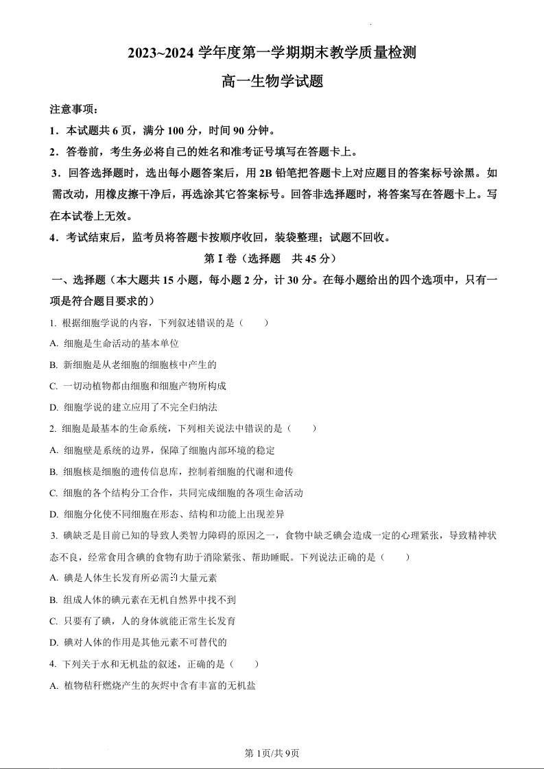 陕西省咸阳市2023-2024学年高一上学期期末考试生物(原卷版)