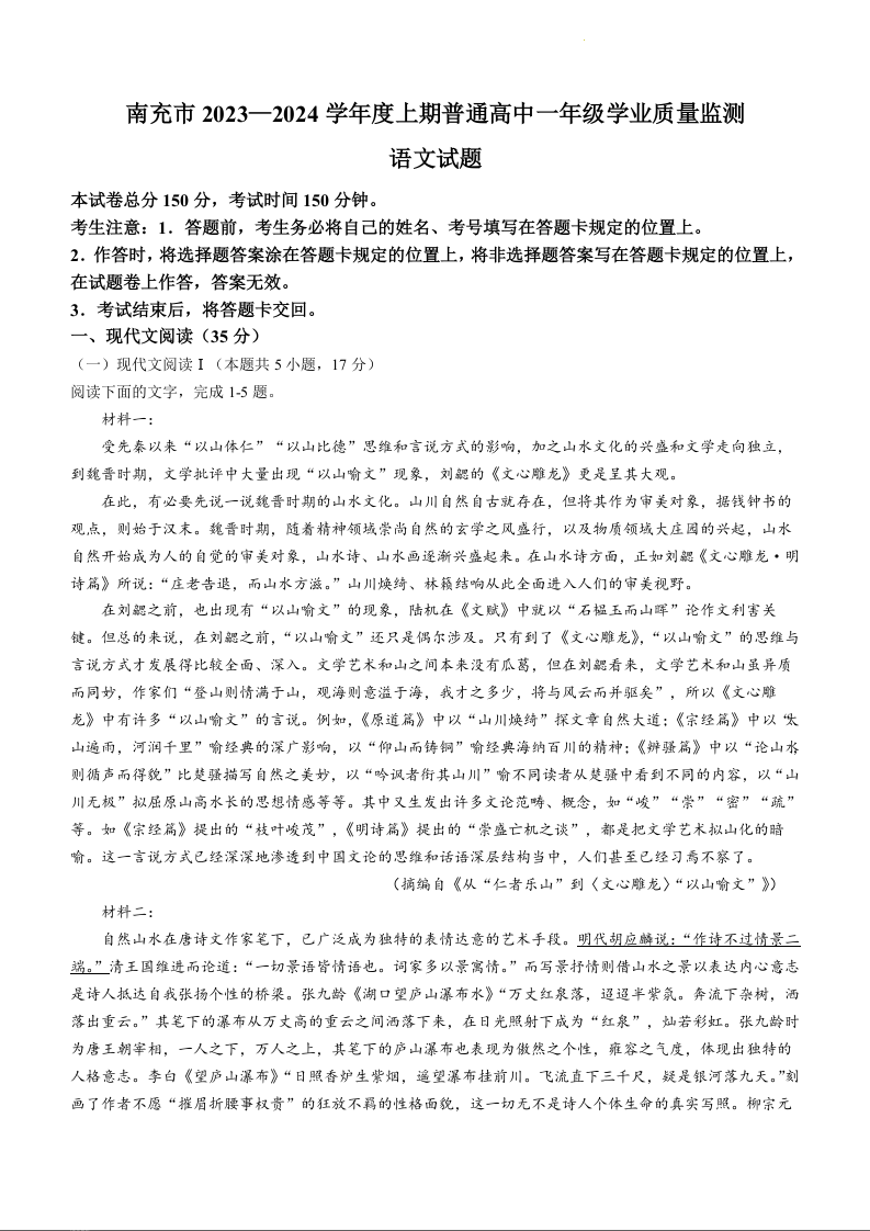 四川省南充市2023-2024学年高一上学期期末学业质量监测语文